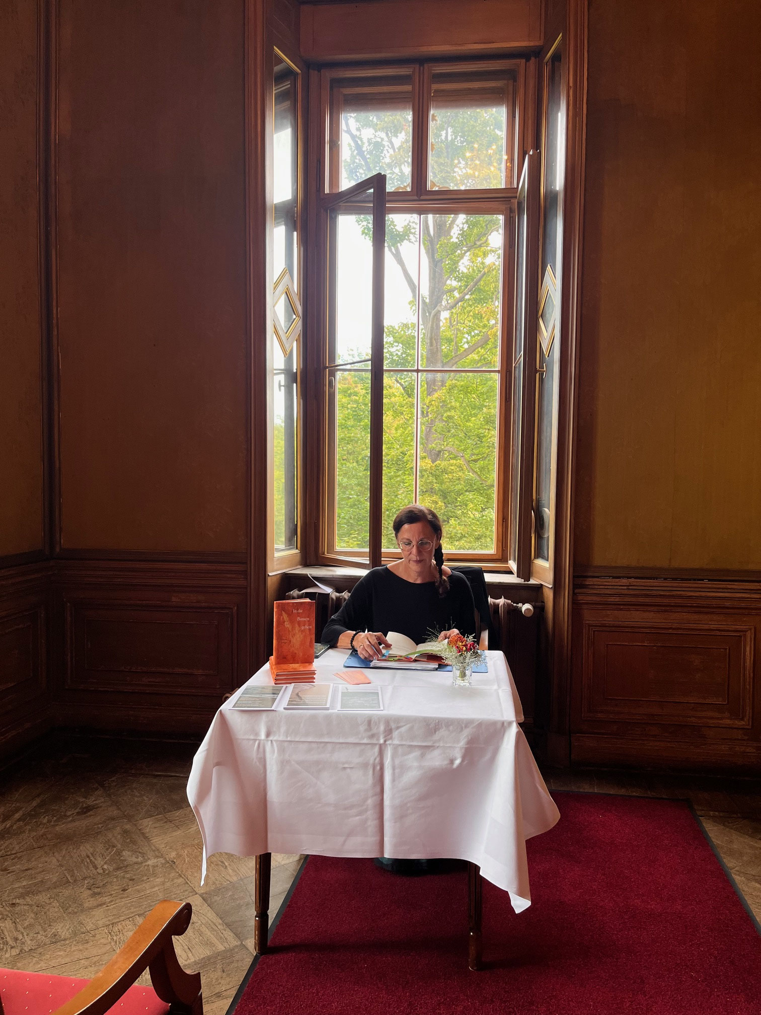 Endlich war es wieder so weit: das Schloss Albrechtsberg öffnete am Sonntag, den 14. September 2025, seine Pforten für Literatur- und Architekturbegeisterte zum Tag des Offenen Denkmals und der Dresdner Literaturmesse „Dresden (er)lesen“. Wir waren selbstverständlich wieder dabei! Unter vergoldeten Decken, umgeben von geschätzten Kolleg*innen hatten wir wieder einmal die Möglichkeit, ganz unmittelbar mit Ihnen, unserer werten Leser*innen-Schaft und unseren Autor*innen, in den Austausch zu treten. Wir bedanken uns herzlich für inspirierende Gespräche, freundliches Feedback und besonders für die rege Teilnahme an unserem ff-Gewinnspiel und an den Lesungen unserer beiden wunderbaren Autor*innen, Eileen Mägel („In die Binsen gehen“) und Friedrich Schollmeyer („Die Schwäne sind verschwommen“). In ihren zwei schönen Lesungen in den prunkvollen Räumlichkeiten des Schlosses präsentierten sie uns ihre Leidenschaft zur Lyrik anhand bekannter und neuer Projekte.